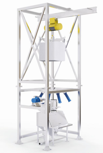 噸包拆包機+真空輸送設備(管鏈輸送機、螺旋輸送機),也可以往料倉、烘干機、篩分機、混合機、反應罐等設備投料